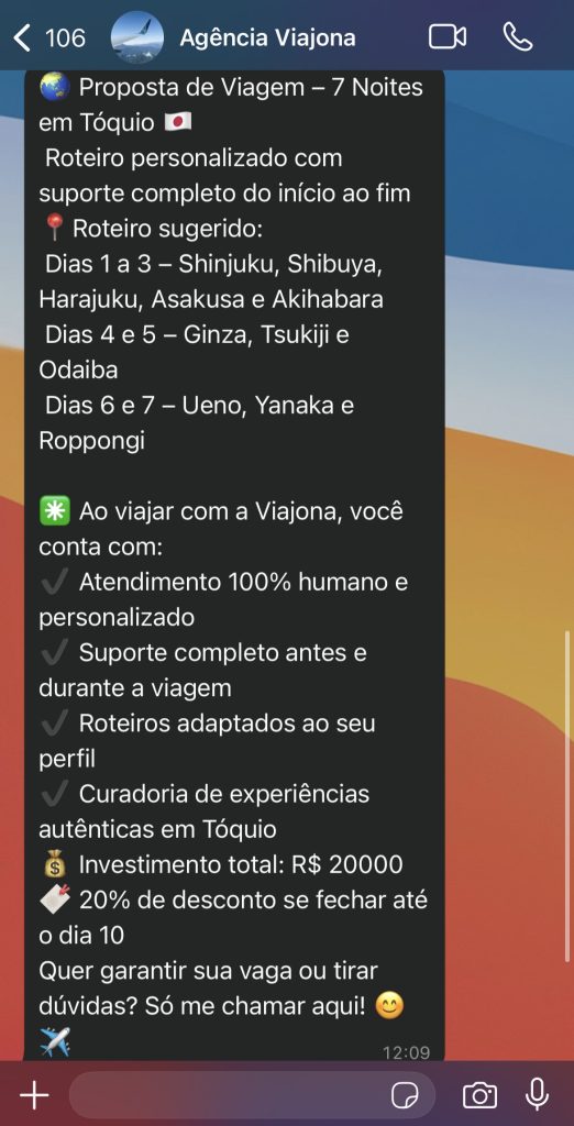 como criar proposta comercial: exemplo de proposta para viagem para o japão enviado por mensagem no whatsapp